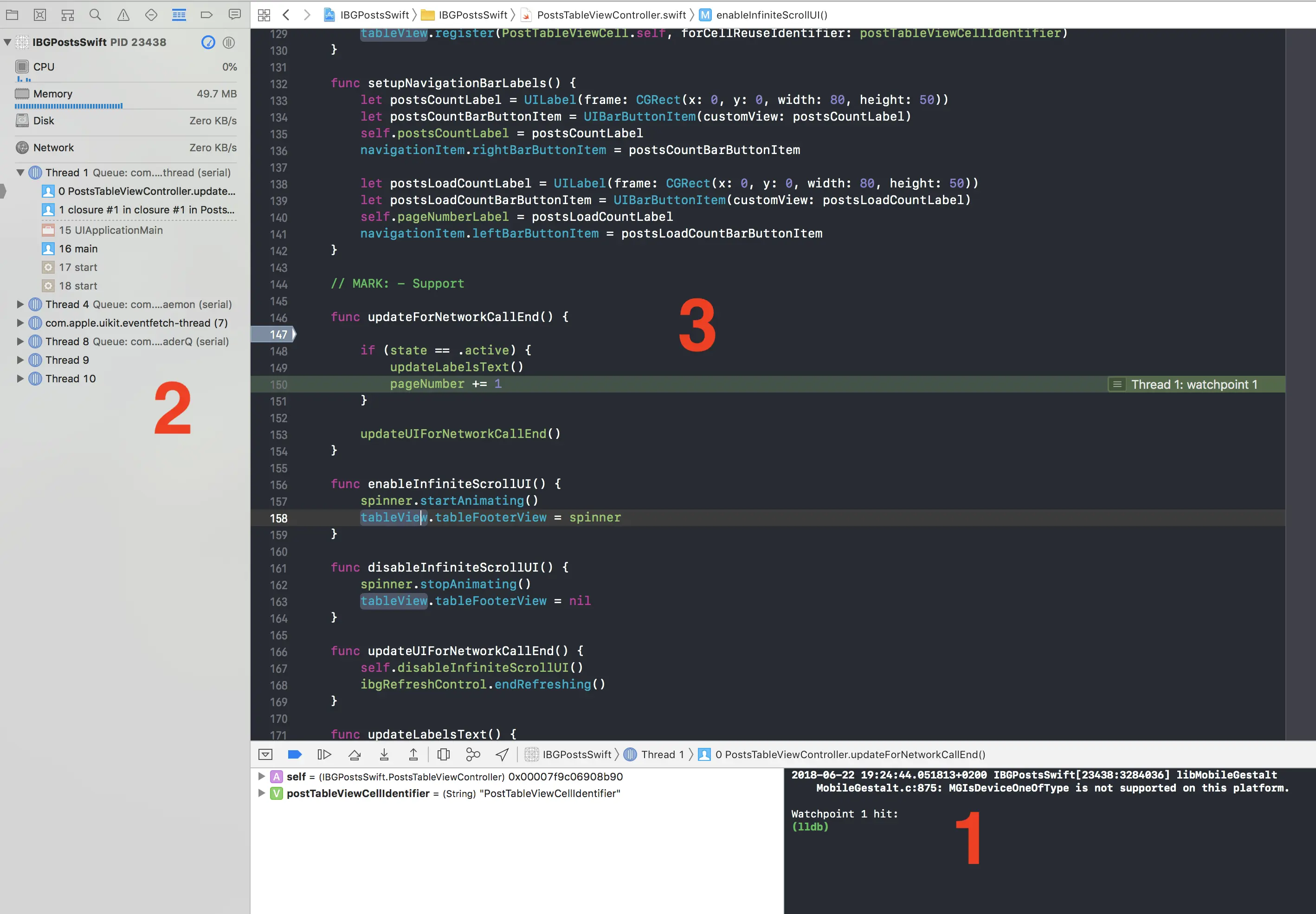 在这个教程的第一部分,你了解到 GET HTTP 请求发生在用 pragma mark Networking 标记的部分。那里只有一个方法 loadPosts。在这个方法的第一行放置一个断点,然后下拉刷新,加载新的文章对象。这个动作会触发你刚才设置的断点。