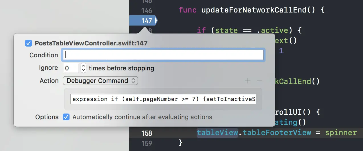在条件语句上一行添加一个断点。接着添加一个调试器动作,然后填写如下的调试器命令。