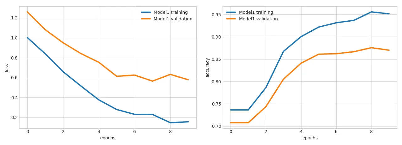 With this command, Ludwig performs a random split of the data in training, validation, and test sets, preprocess them, and builds four different encoders for the four inputs and one combiner and two decoders for the two output targets. Then, it trains the model on the training set until the accuracy on the validation set stops improving or the maximum number of ten epochs is reached.
