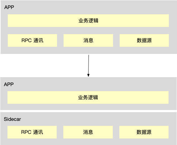 除了 RPC 通讯,我们还可以下沉消息、数据源等能力至 Sidecar 中,业务应用可以越来越薄,SDK 实现成本也降低到可接受的程度,基础设施层与业务剥离,双方均可独立演进。