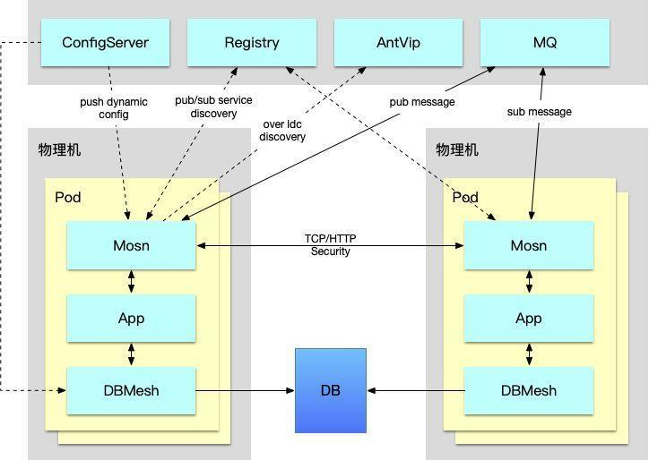 不同于开源的 Istio 体系,蚂蚁金服内部版 Service Mesh 落地优先考虑数据面的实现与落地,控制面在逐步建设中,整体的架构上看,我们使用数据面直接和内部的各种中间件服务端对接,来完成 RPC、消息等能力的下沉,给业务应用减负。由上图可以看出,我们将不同的 Sidecar 与业务应用编排在同一个 Pod 中,App 与 SOFAMosn 直接通讯,SOFAMosn 来负责目标接口的服务发现、路由寻址,并且由 SOFAMosn 内置的安全模块来做应用间调用的加密鉴权。通过 DBMesh 的 Sidecar 来实现数据层的下沉,App 不在需要与多个数据源建立连接,只需要连接本 Pod 内的 DBMesh 即可完成数据层调用,数据库的用户名、密码、分库分表规则等均不再需要关心。