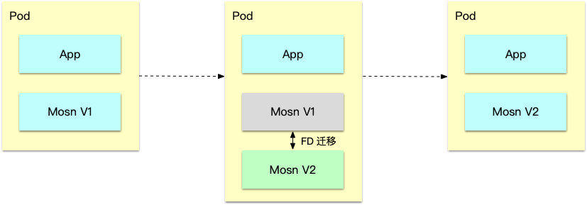 由于 SOFAMosn 与应用是独立的 container,如上图描述,SOFAMosn 的升级是需要做到 Pod 内镜像的热替换,这种热替换能力必须要保障几点: