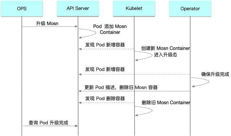 为了达成以上目标,我们通过对 Kubernetes 的改造以及自定义 Operator 来完成以上升级的处理。处理流程如下: