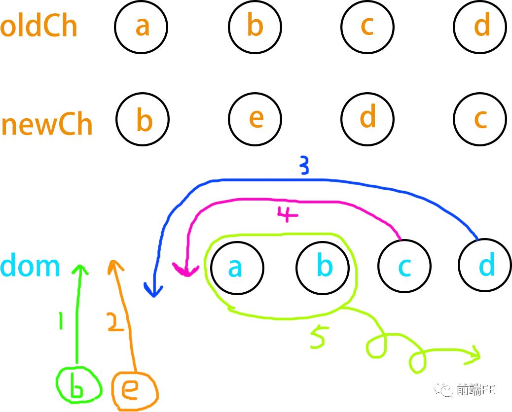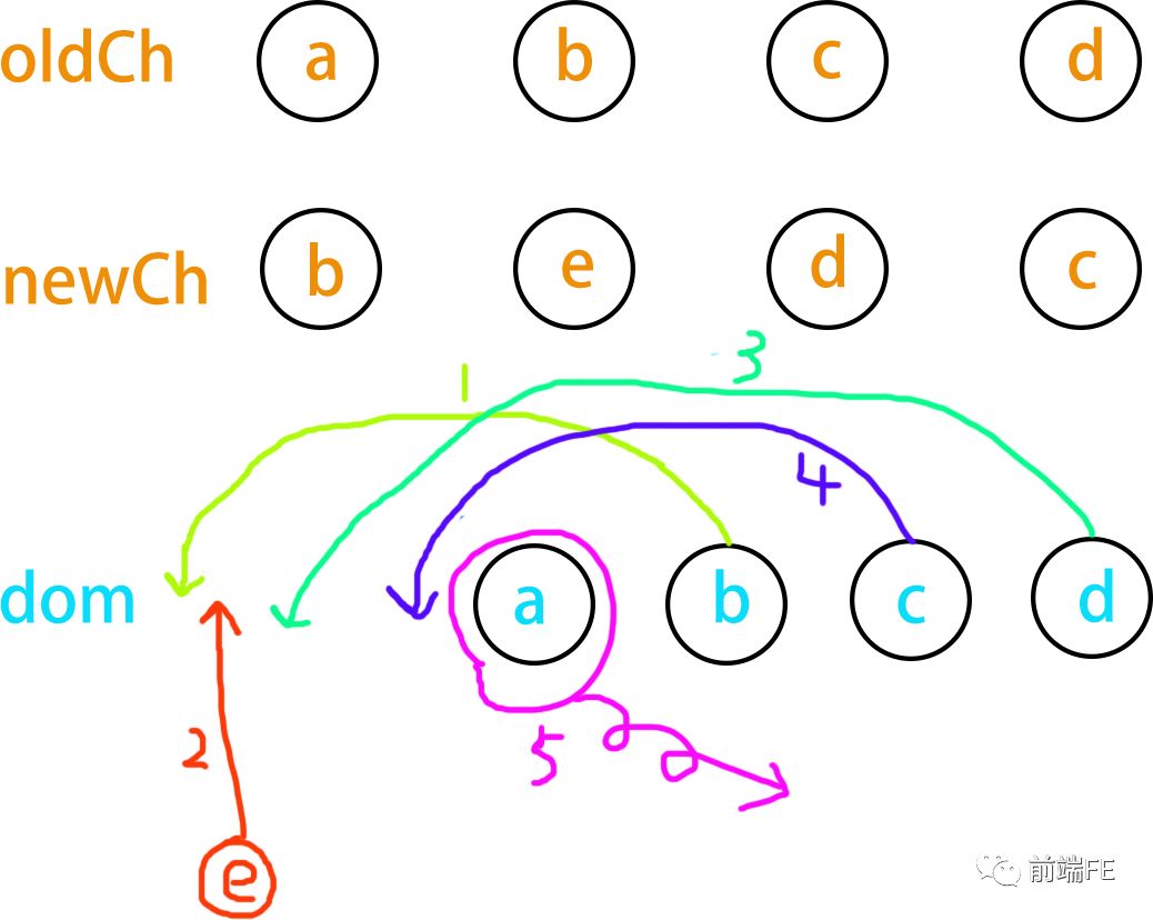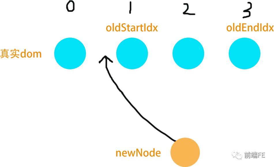 当oldEndVnode ,newStartVnode 值得比较,说明 oldEndVnode.el 跑到了newStartVnode.el 的前边。(这里笔误,应该是“oldEndVnode.el跑到了oldStartVnode.el的前边”,准确的说应该是oldEndVnode.el需要移动到oldStartVnode.el的前边”)