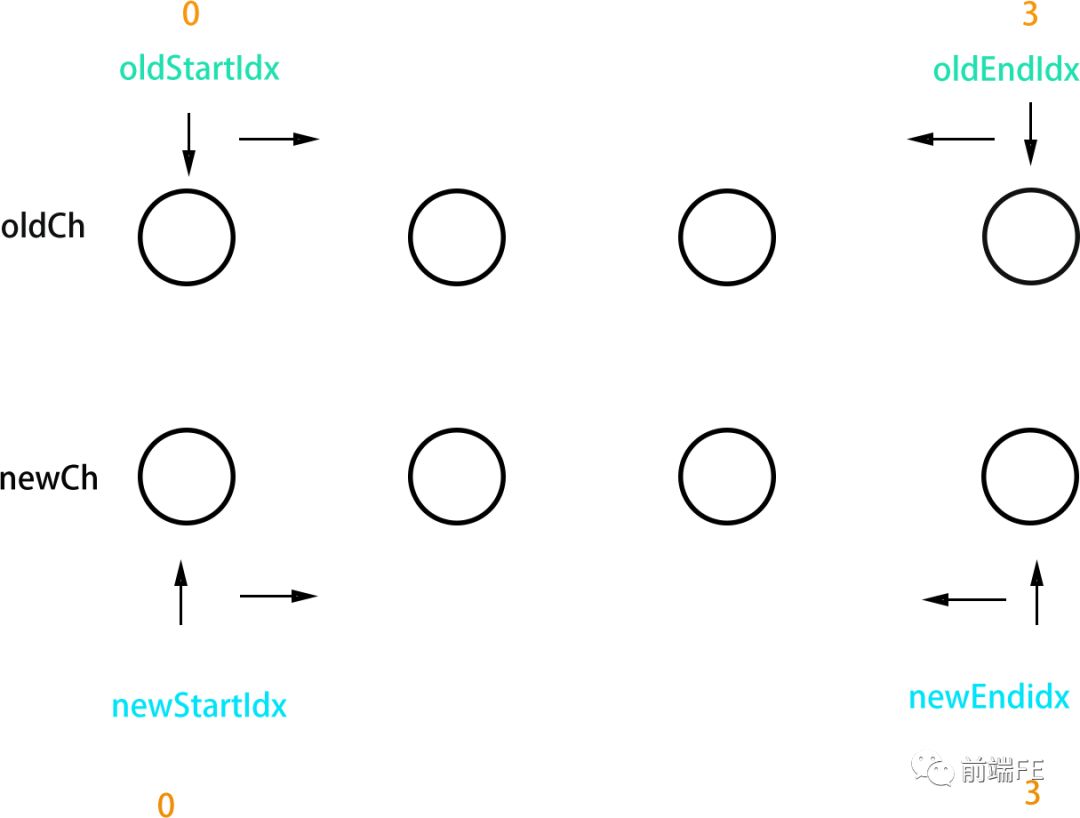 过程可以概括为:oldCh 和newCh 各有两个头尾的变量StartIdx 和EndIdx ,它们的2个变量相互比较,一共有4种比较方式。如果4种比较都没匹配,如果设置了key,就会用key进行比较,在比较的过程中,变量会往中间靠,一旦StartIdx>EndIdx 表明oldCh 和newCh 至少有一个已经遍历完了,就会结束比较。
