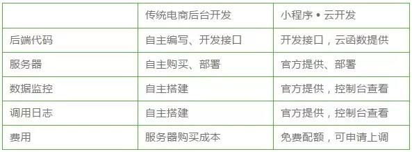 而且,云开发还具有商业和技术两方面的多项优点,能让小程序开发更加高效。以电商开发为例,小程序·云开发就在后端代码、服务器、费用等方面有着独特的优势,从而解决了传统电商后台开发的一些局限性。