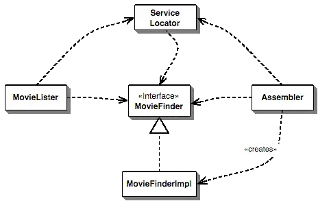 此时,MovieLister 类的提供者也应该一并提供一个定位器接口,使用者可以通过这个接口获得MovieFinder实例。