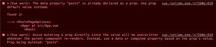 错误原因是目标组件中已经声明了一个叫 posts 的 prop 了。