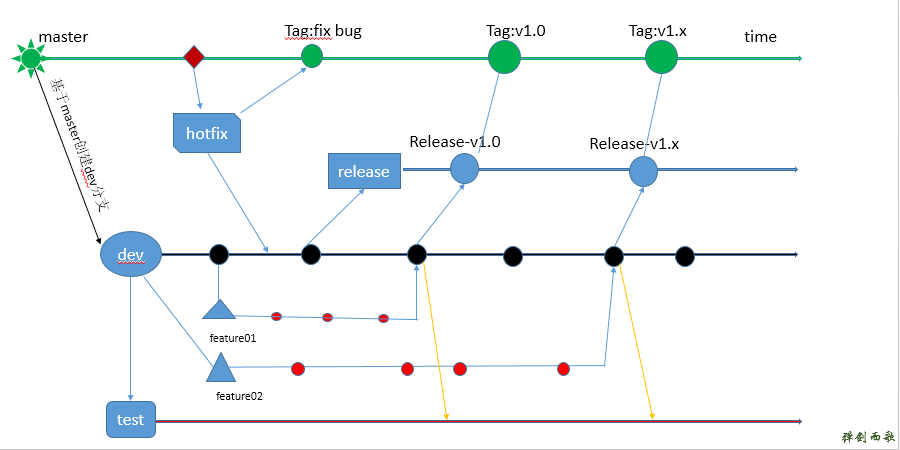 最近项目使用git做分支管理,和大家分享一下。 先上图: