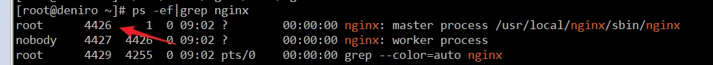 也可以直接在 kill 指令发送 QUIT 信号给 Nginx master 进程来安全地停止服务: 首先通过 ps 指令找到 Nginx master 进程的 pid: