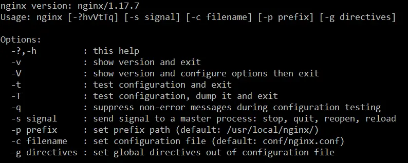 通过 -? 或者 -h 可以显示 Nginx 的命令帮助说明:
