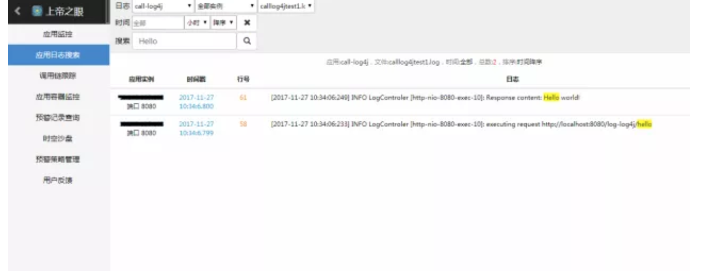 通过特定特征(图中为按照Hello关键字进行搜索)搜索出符合条件的日志。