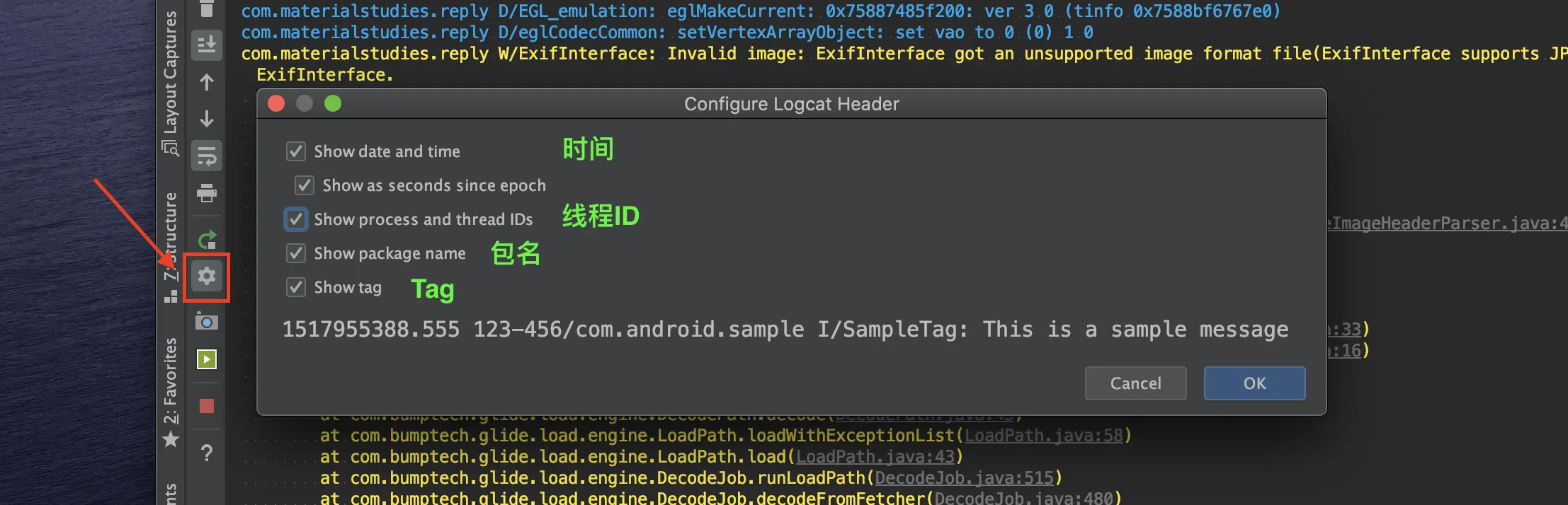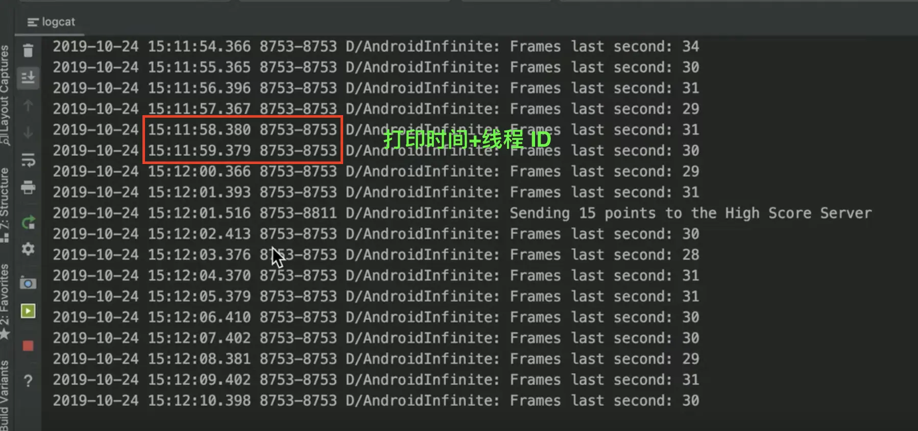 有时候 Logcat 中 log 的信息很长,同时还有些我们不需要的信息也打印出来,例如下图中的【时间+线程 ID】。