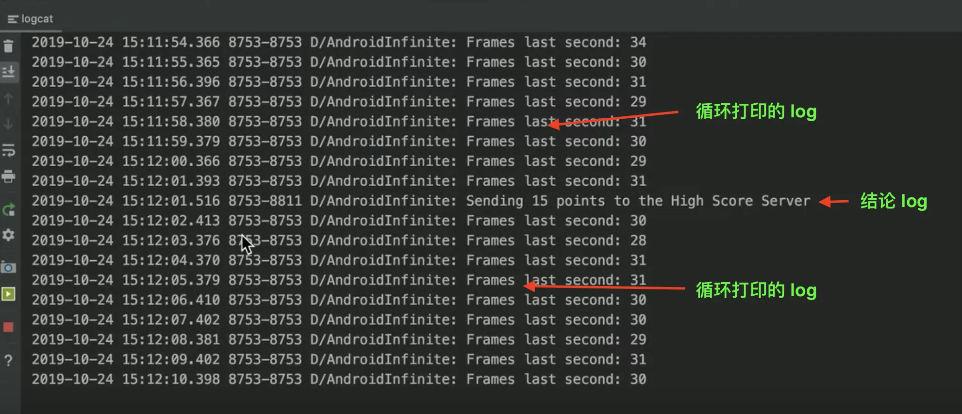 日常开发的时候我们还会遇到另一种情况,比如根据当前 UI 的渲染情况,我们需要时刻打印 UI 的某个值,来帮助我们观察 UI,同时当到达某种条件的时候,输入一条我们得到的【结果 log】。也就是说在获得我们的【结果 log】之前会有很多没用但是又必须打印的 log,这样当我们需要查找【结果 log】的时候就会非常麻烦。
