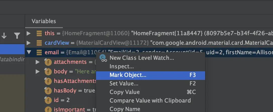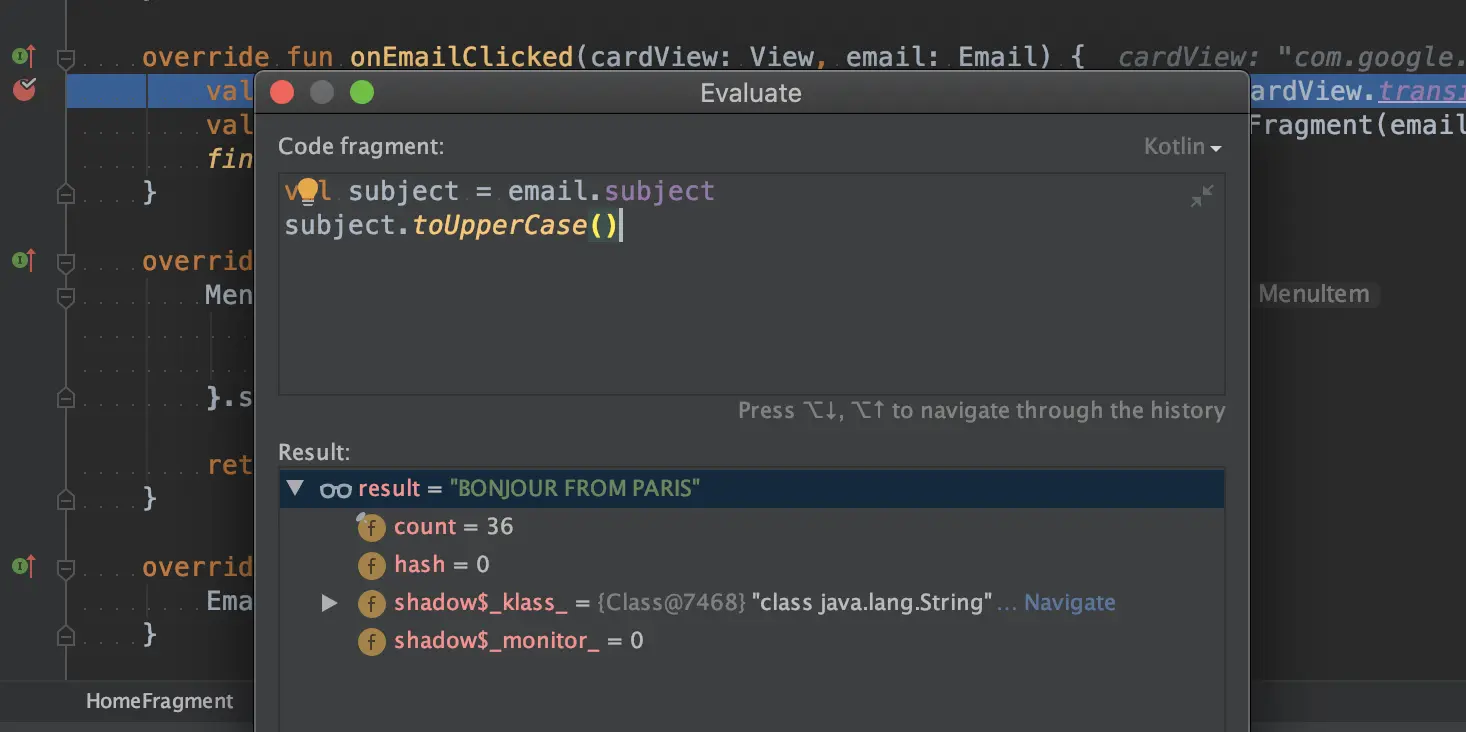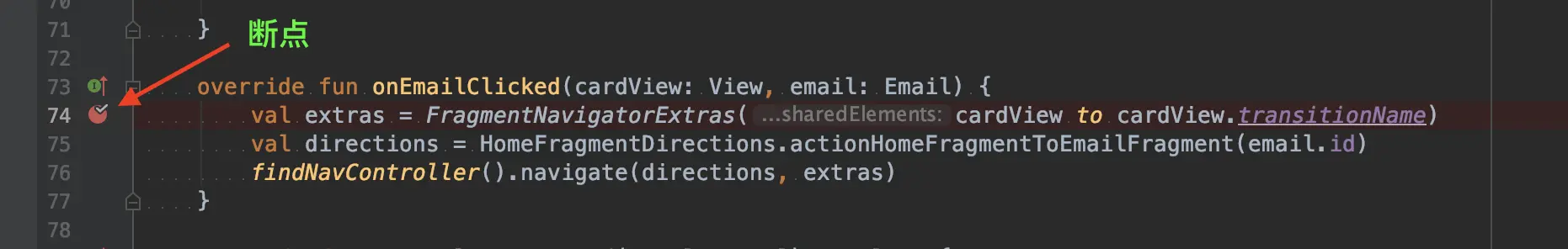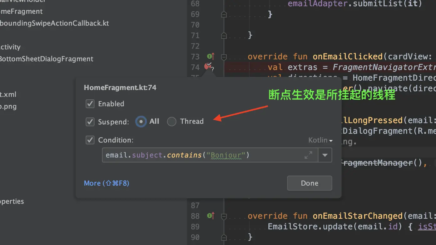我们来看上面这段代码,通过字面意思我们可以得知:这是一个点击事件执行的方法,点击发生后通过 NavController 从当前 HomeFragment 跳转到 EmailFragment。然后我们在第一行打了一个断点,我们已经得知当 email 的 subject 包含 【Bonjour】关键字的时候,这段代码会发生崩溃,反之不包含则不会发生崩溃,所以我们不需要每次断点都生效。