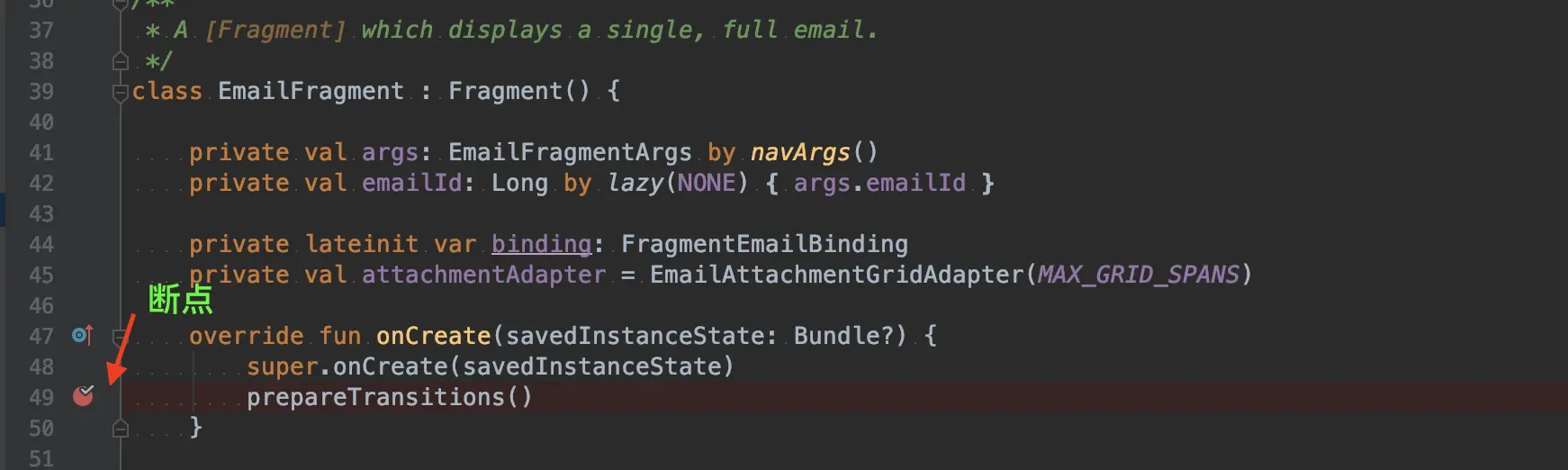 然后如果我们想在跳转到 EmailFragment 之后进一步去追踪问题,于是我在 EmailFragment 的 onCreate 方法打了一个断点(如下图所示),然后这里还会遇到我们之前说的问题:不符合条件的时候断点也会生效,这时候我们该怎么办呢?