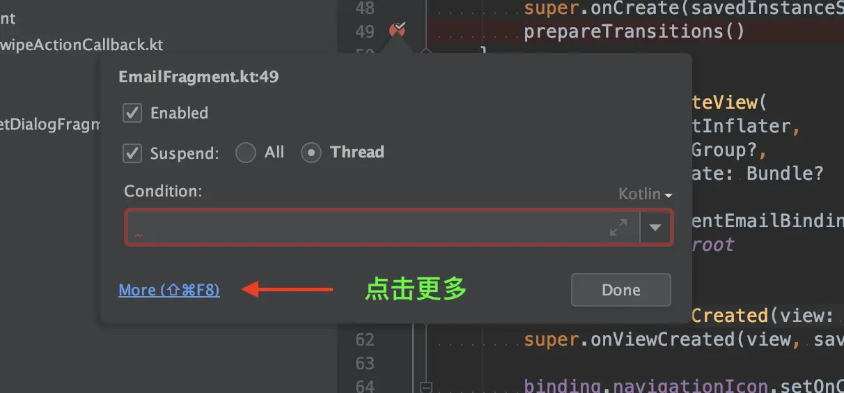 这里我们可以右键断点,在 Condition 里输入我们的条件判断语句,当条件允许的时候,断点才生效。条件语句的代码支持 Kotlin 和 Java 两种语言的写法,如下图所示。