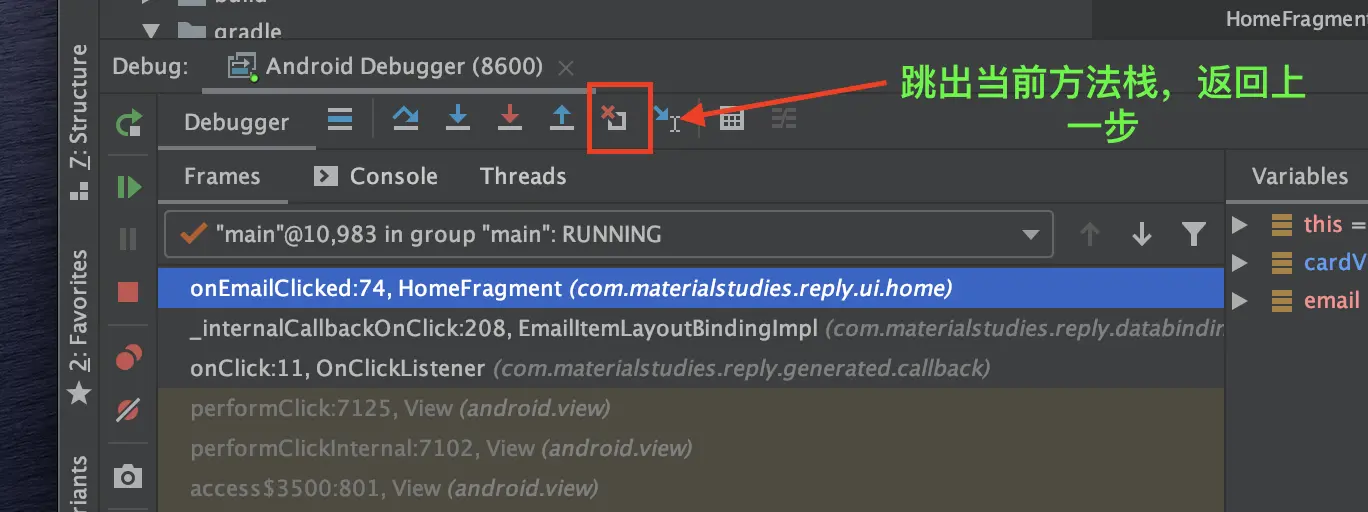 在运行 Android 10 的设备上,debug 界面中提供了一个叫【Drop frame】的按钮,可以供我们跳出当前方法栈,返回上一步,这样就会避免我们因为错过断点而不得不重新运行代码。