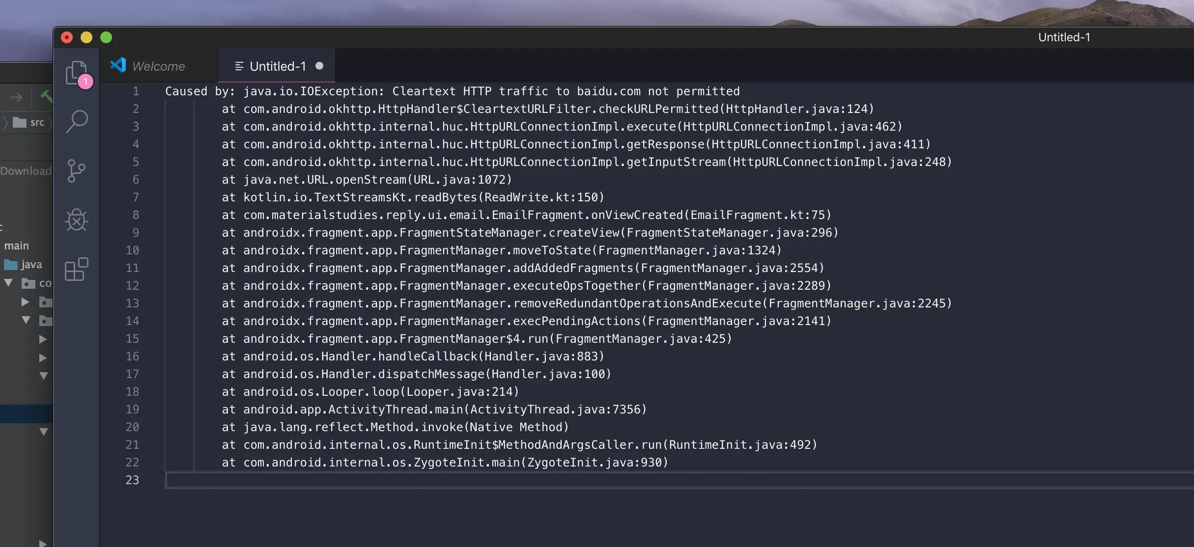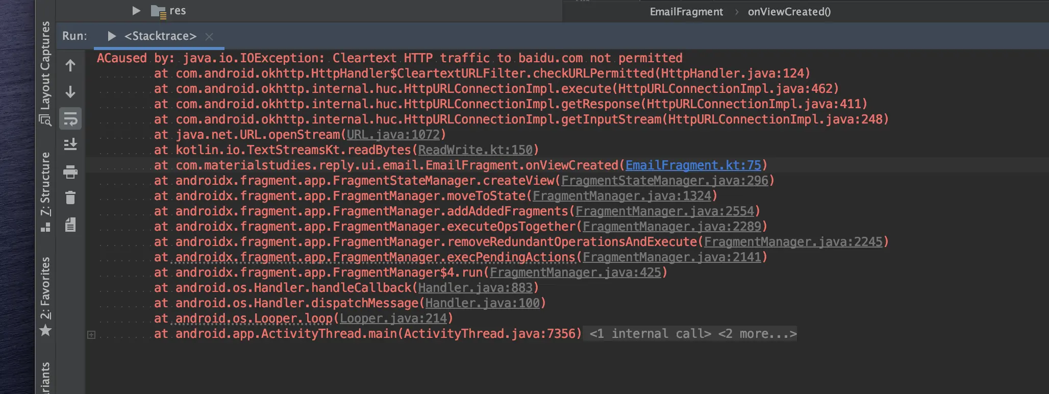 Android Studio 会在控制台显示这段异常栈信息,并且与现有代码 Link 在一起,我们可以点击跳转到问题所在行。