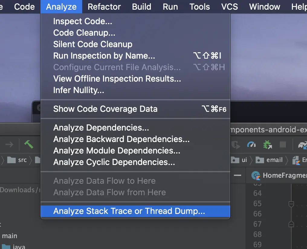 我们可以全选复制,打开我们的 Android Studio,选择 Analyze → Analyze Stack Trace or Thread Dump,然后把异常栈信息粘贴进去,点击确定。