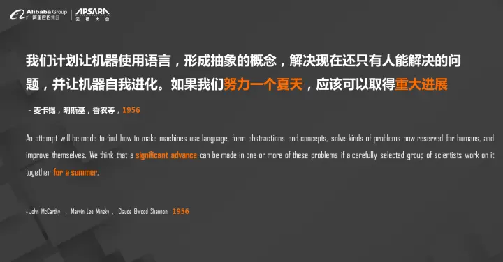 通过翻阅历史书我得知,最早提出人工智能概念的人是麦卡锡,这个预言是做什么呢?让机器使用语言让它来解决现在还只有人能够解决的问题。最重要的一点,既然是一个智能企业,那么它能够自我进化,大家觉得努力一个夏天,就能够取得重大的进展,这是1956年发生的事情。现在我们知道,除了产生了一些人工智能的定义,剩下的什么都没有发生。