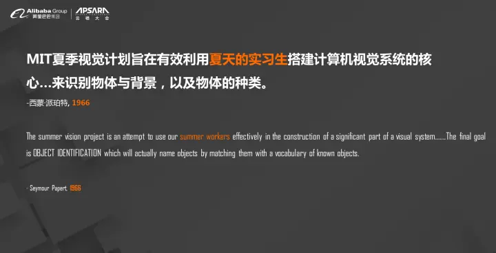 到了1966年,我们听到一句话:我们有非常好的想法,只差一个程序了。当时有一个教授提出了MIT的夏季视觉计划,要有效的利用夏天实习生来搭建计算机视觉系统的核心来识别物体与背景,以及物体的种类。1966年的夏天过去了,什么都没有发生,1966年我们没有看到无人车,现在也没有看到无人车。