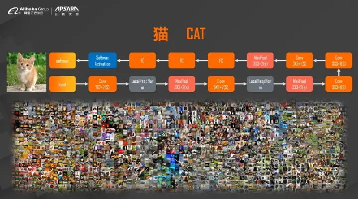 我们刚才说120万张图片的数据集,在实际的应用之中,我们发现数据的数量是呈指数级的增长,而且是成千上万倍差别的,拍立淘是阿里巴巴用来让用户用手机拍一个图片来看在淘宝之中相似的图片是怎么样的,拍立淘模型训练需要一个PB左右的图像,和现在的图像相比,大了非常多,计算量也大了许多。在我们今天有了大量数据的情况下,不仅是数据量给我们带来了很大的挑战,而且数据的质量也给我们带来了很大的挑战。我们在实验室当中做计算机视觉、语言、图像等等工作的时候,这些数据是比较简单的,我们可以想象一下怎么样存储图片?就是有一个文件夹放一个图片在里面就可以了,但是在实际应用中,我们在做推荐系统的时候,这些数据一定程度上是比较脏的,不是说它比较差,而是它本身需要大量的处理,很多核心推荐算法的来源是用户购买的行为,哪些行为存在log里边,我们需要来理解这个log,通过比较复杂的数据链路来清洗数据,所以我们说算力算法数据的合成是AI的三个要素。