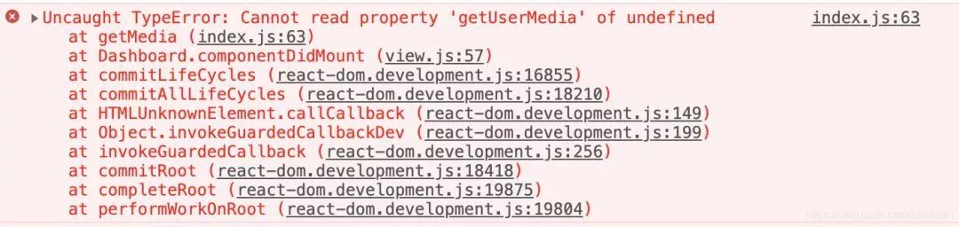 注意:Chrome 47以后,getUserMedia API只能允许来自“安全可信”的客户端的视频音频请求,如HTTPS和本地的Localhost。如果页面的脚本从一个非安全源加载,navigator对象中则没有可用的mediaDevices对象,Chrome抛出错误。