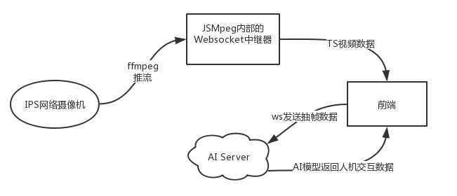 使用 IPC 网络摄像头,其标准视频输出格式为 RTSP (Real Time Streaming Protocol)。原生的video播放器肯定是无法满足使用的,所以需要对源视频流进行编解码。经过调研后,采用了轻量级的纯JS解码器JSMpeg ,其支持将Hevc编码的rtsp视频流解码并以MPEG1视频编码格式输出,本项目不对音频做分析即丢弃不做编码,然后JSMpeg可以连接到WebSocket服务器并发送二进制MPEG-TS数据。前端保持长连接接收视频流TS分片,并在Canvas上播放。经过测试,我们发现JSMpeg可以满足以30fps的速度处理720p视频。