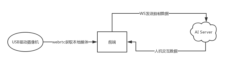 使用USB驱动或内置摄像头,通过WebRTC提供的API直接获取本地媒体MediaSteam,直接捕获视频流在canvas上播放。由于获取的是本地媒体流,不需要网络传输和解码,相比于方案1,前端的处理工作大大减少,接下来不间断地保持抽帧发送给服务端即可。