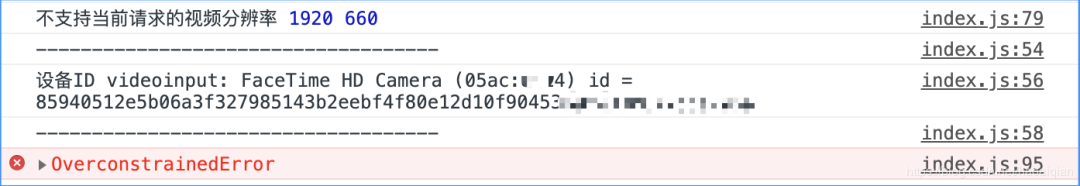 当你对deviceId使用了exact, 且指定的设备不存在或者约束无法满足时,浏览器会抛出一个OverconstrainedError错误: