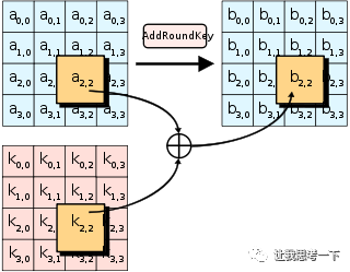 128bit的轮密钥同样被排列成4X4的矩阵,输出值b[i,j] = a[i,j] XOR k[i,j]。