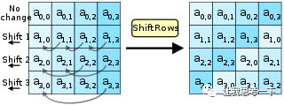 这一步就像图中所描述的:第一行不变,第二行循环左移1个字节,第三行循环左移2个字节,第四行循环左移3个字节。