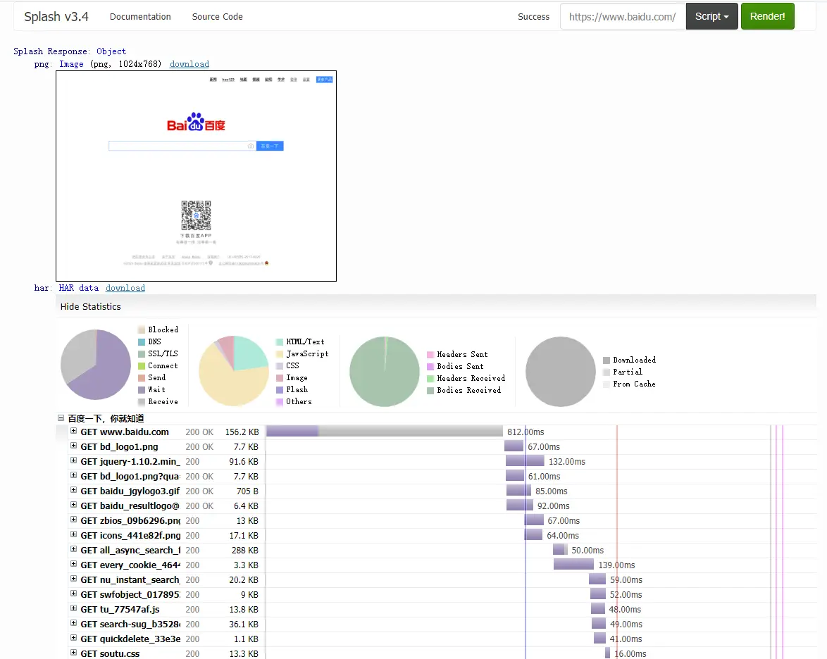 可以看到,网页的返回结果呈现了渲染截图、 HAR 加载统计数据、网页的源代码。