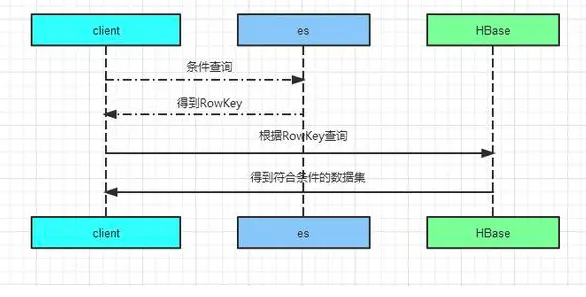 它们之间的交互大概是这样的:先根据用户输入的条件去es查询获取符合过滤条件的rowkey值,然后用rowkey值去HBase查询,后面这一查询步骤的时间几乎可以忽略,因为这是HBase最擅长的场景,交互图如下所示:
