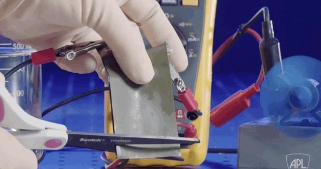 而且,这种新电池也不怕外部破坏,用剪刀剪掉一块,再放进盐水里,它不会被剪坏,还耐腐蚀,仍然可以供电。