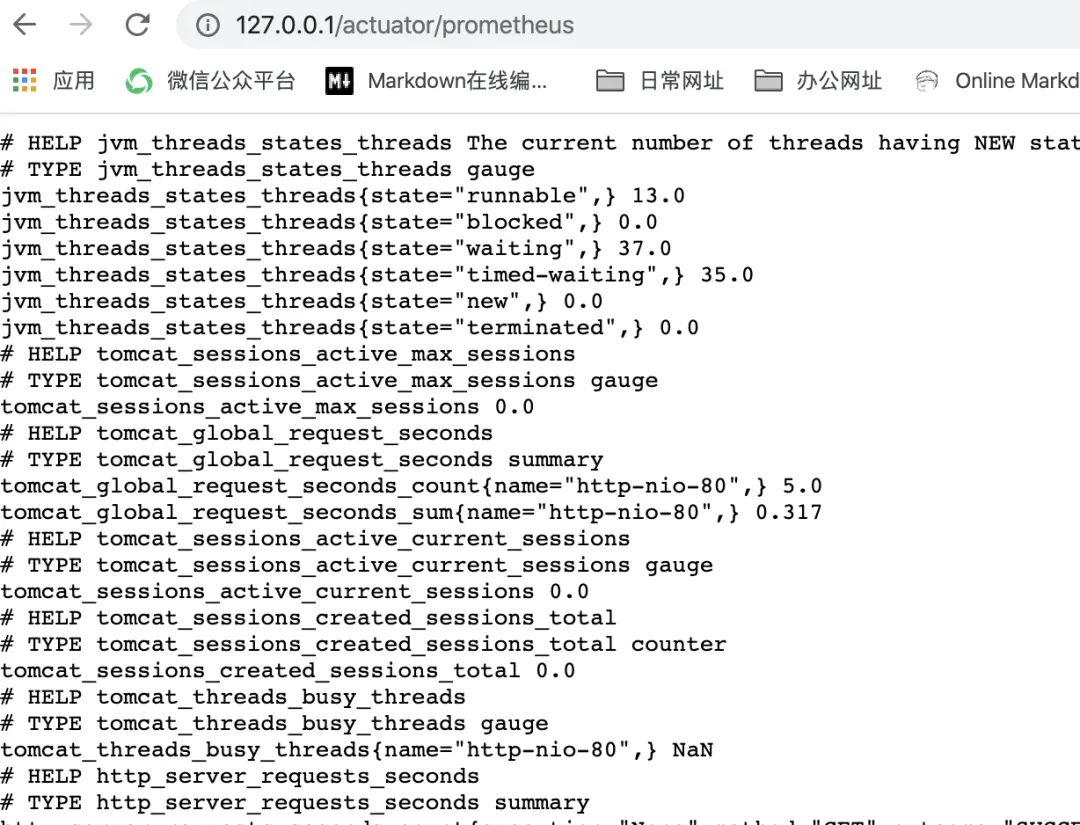 info:alen:alenmanagement:endpoints:web:base-path:/actuatorexposure:include:"*"启动Springboot后,可以通过下面URL看能不能正确获取到监控数据:localhost/actuator/prometheus 获取数据成功,说明Springboot能正常提供监控数据。