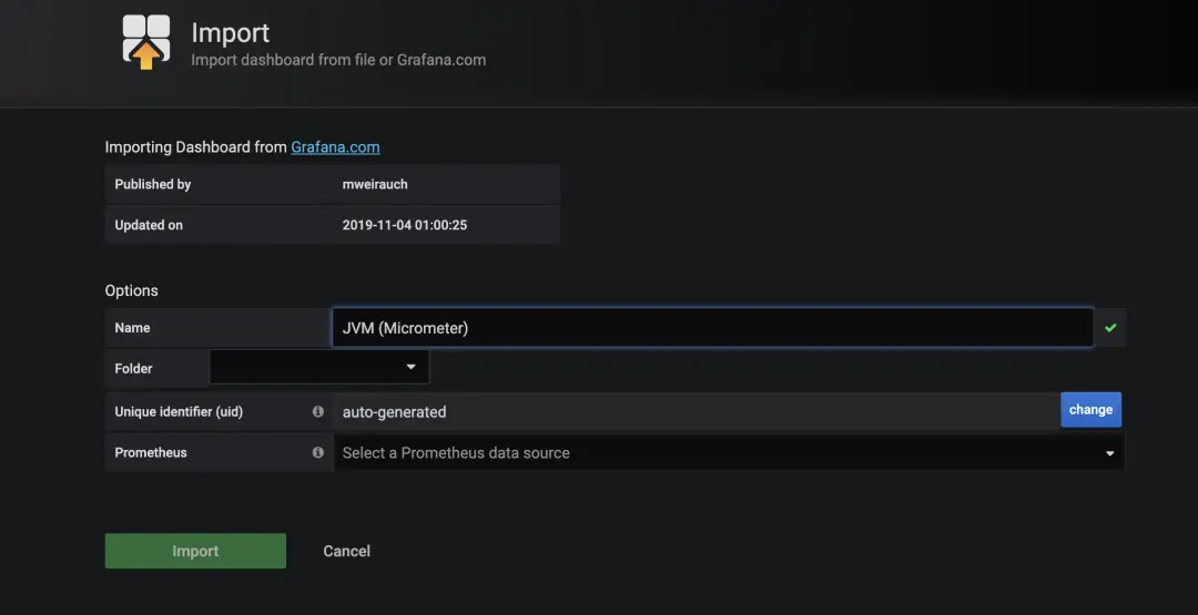 默认启动后Grafana地址为:http://localhost:3000/,登录用户名和密码是admin/admin,import配置grafana id = 4701