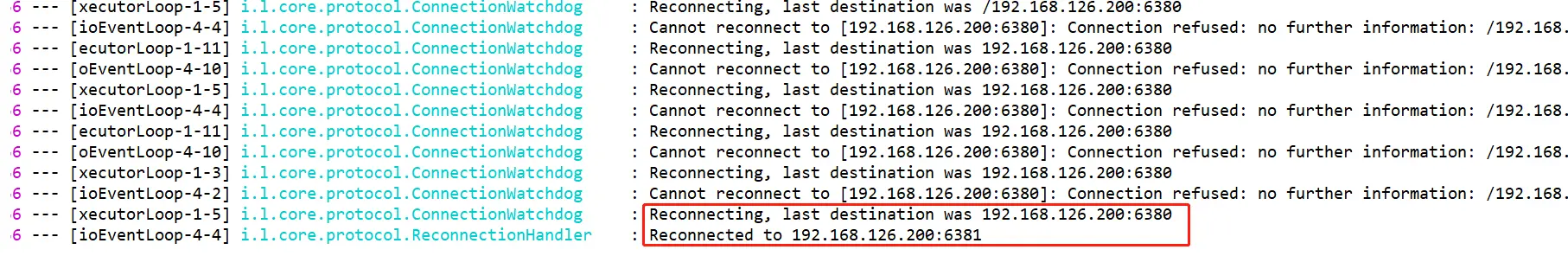 手动shutdown redis的master服务后,后台会尝试重连,当超过最大等待时间,无法连接后,sentinel会重新选举出一个新的master,程序获取到新的master节点,提供读写服务