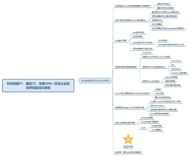 Android应用是由Java语言进行开发的,SDK也是由Java语言编写,所以我们要学习java语言。另外,虽说kotlin语言得到了Android官方的热推,但是kotlin也是编译成了java语言再运行的。对于Android来说,只要SDK没有用kotlin重写,那么Java语言是都需要学习的。而且Androidapk的后台服务器程序大概率是java语言构建,所以学习java也是一种必然。那么Java中哪些东西是我们Android程序员需要学习的呢?由于Android程序员习惯了CV代码块,所以与Android中比较相关的稍微比较难的Java基础几乎都是一个门槛,像泛型,多线程,反射,JVM,JavaIO,注解,序列化等,都是被CV的对象,而程序员是不懂原理的,具体内容如大纲所示。