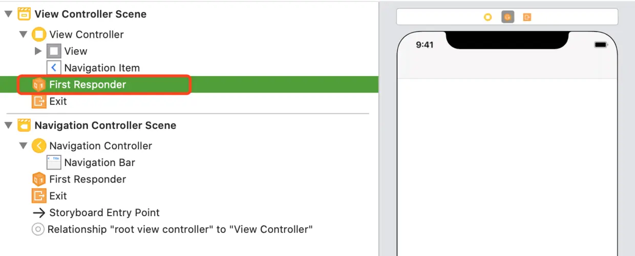 第一响应者就是第一个接收事件的对象。我们在使用 Xcode 中的 storyboard 画视图的时候,可以看到视图结构中存在 First Responder: