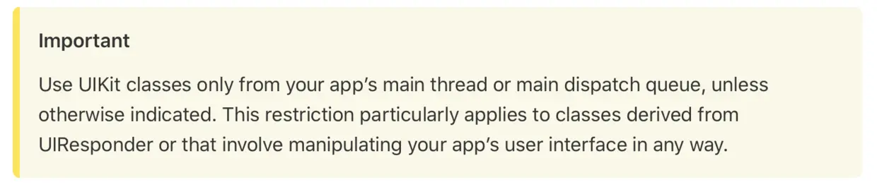翻译一下:除非另有说明,只能在 主线程(main thread) 或者 主调度队列(main dispatch queue) 中使用 UIKit 的类。这个限制适用于所有 UIResponder 的派生类或以任何方式涉及到用户交互界面的操作。