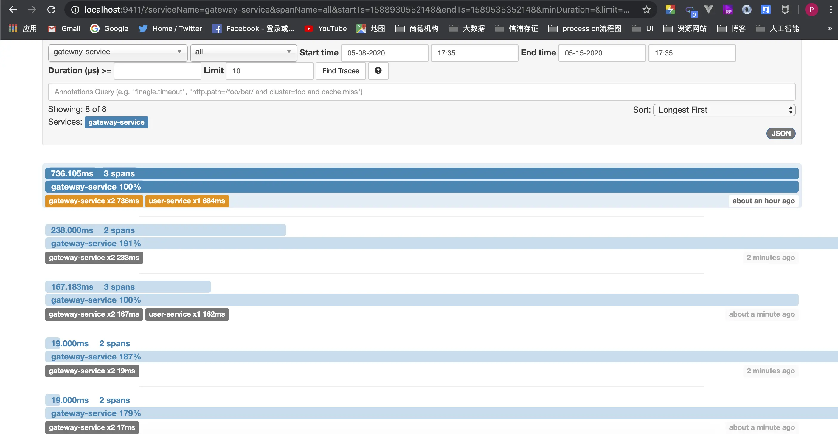 - 这个界面主要用来查找服务的调用情况,可以根据服务名、开始时间、结束时间、请求消耗的时间等条件来查找。点击“Find Trackes”按钮,界面如图所示。从图可知服务的调用情况,比如服务调用时间、服务的消耗时间,服务调用的链路情况。