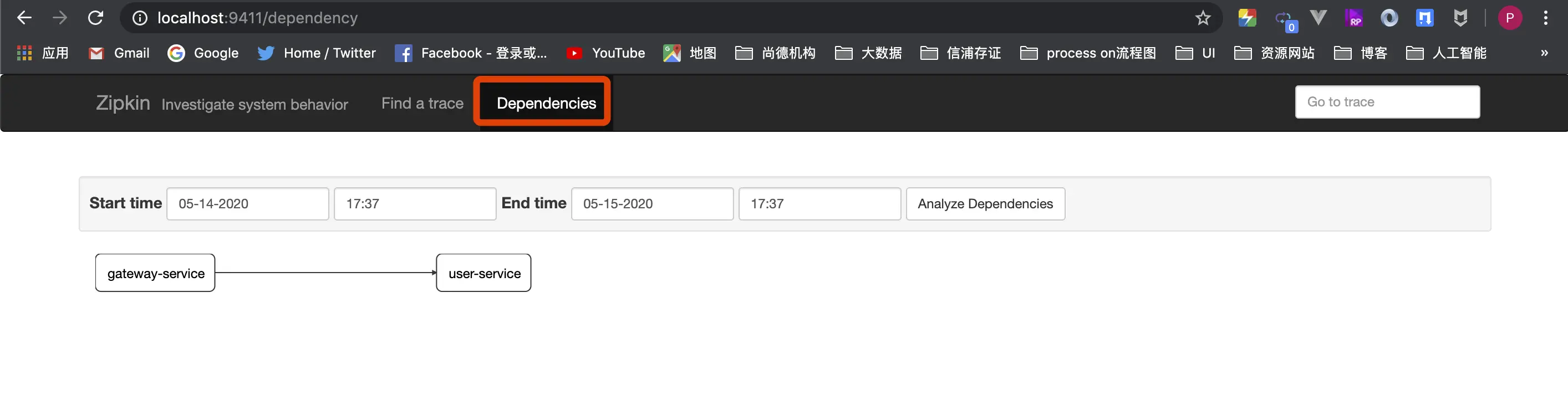 - 点击Dependences按钮,可以查看服务的依赖关系,在本案例中,gateway-service将请求转发到了user-service,它们的依赖关系如图: