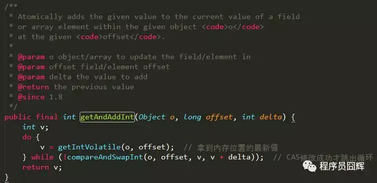 getAndAddInt方法解析:拿到内存位置的最新值v,使用CAS尝试修将内存位置的值修改为目标值v+delta,如果修改失败,则获取该内存位置的新值v,然后继续尝试,直至修改成功。