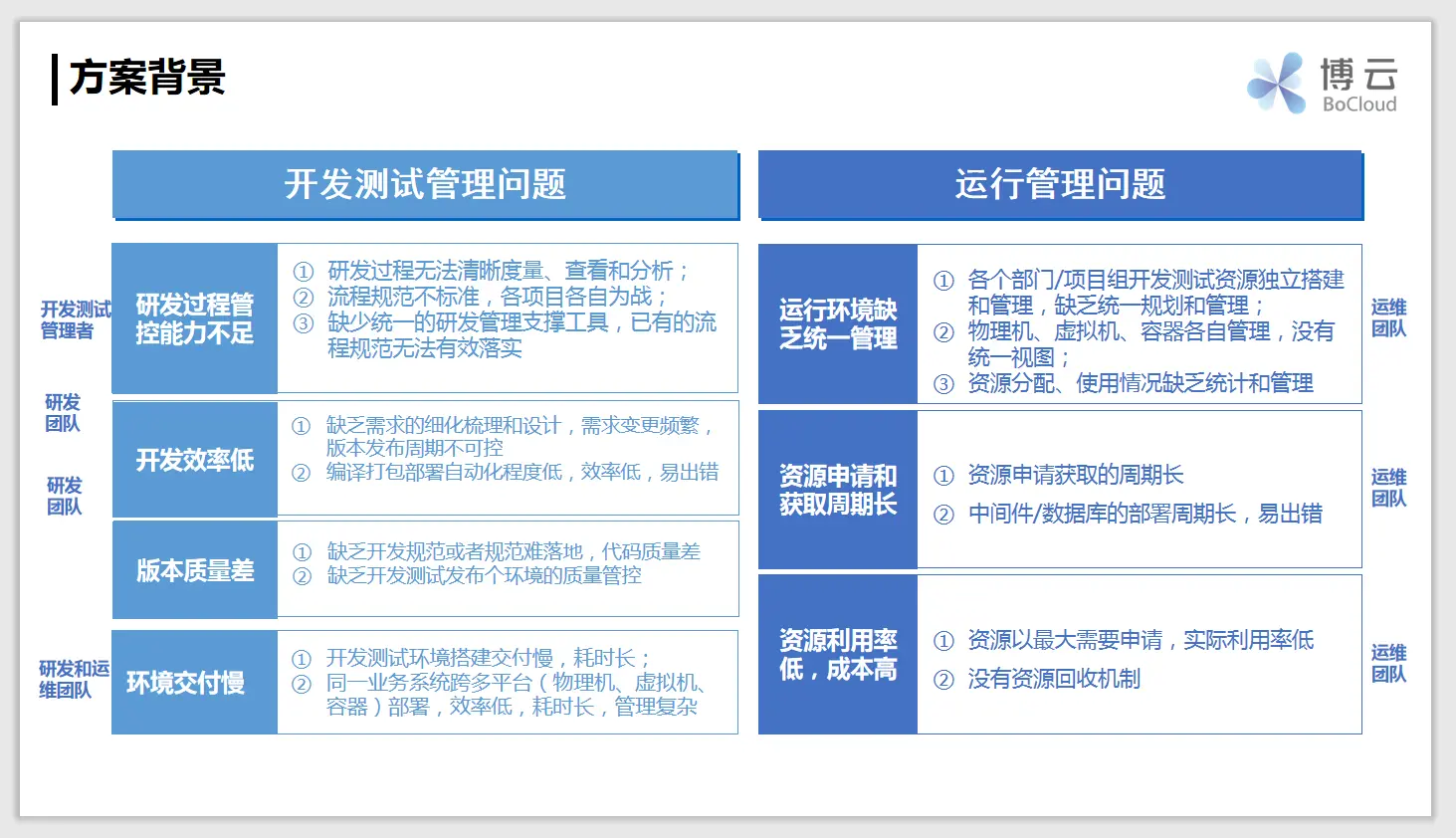 在为客户进行DevOps咨询和提供解决方案时,除了“又快又好”的发布之外,我们发现客户通常还有两大方面需求:开发测试管理问题和运行管理问题。以某大型金融企业为例,该企业开发测试问题主要表现为研发过程的管控不足,这带来了开发效率低、版本质量差、环境交付慢等一系列问题。另外,整个运行环境缺乏统一管理,资源申请和获取周期长,资源利用率低也是当前运行管理中频繁出现的问题。