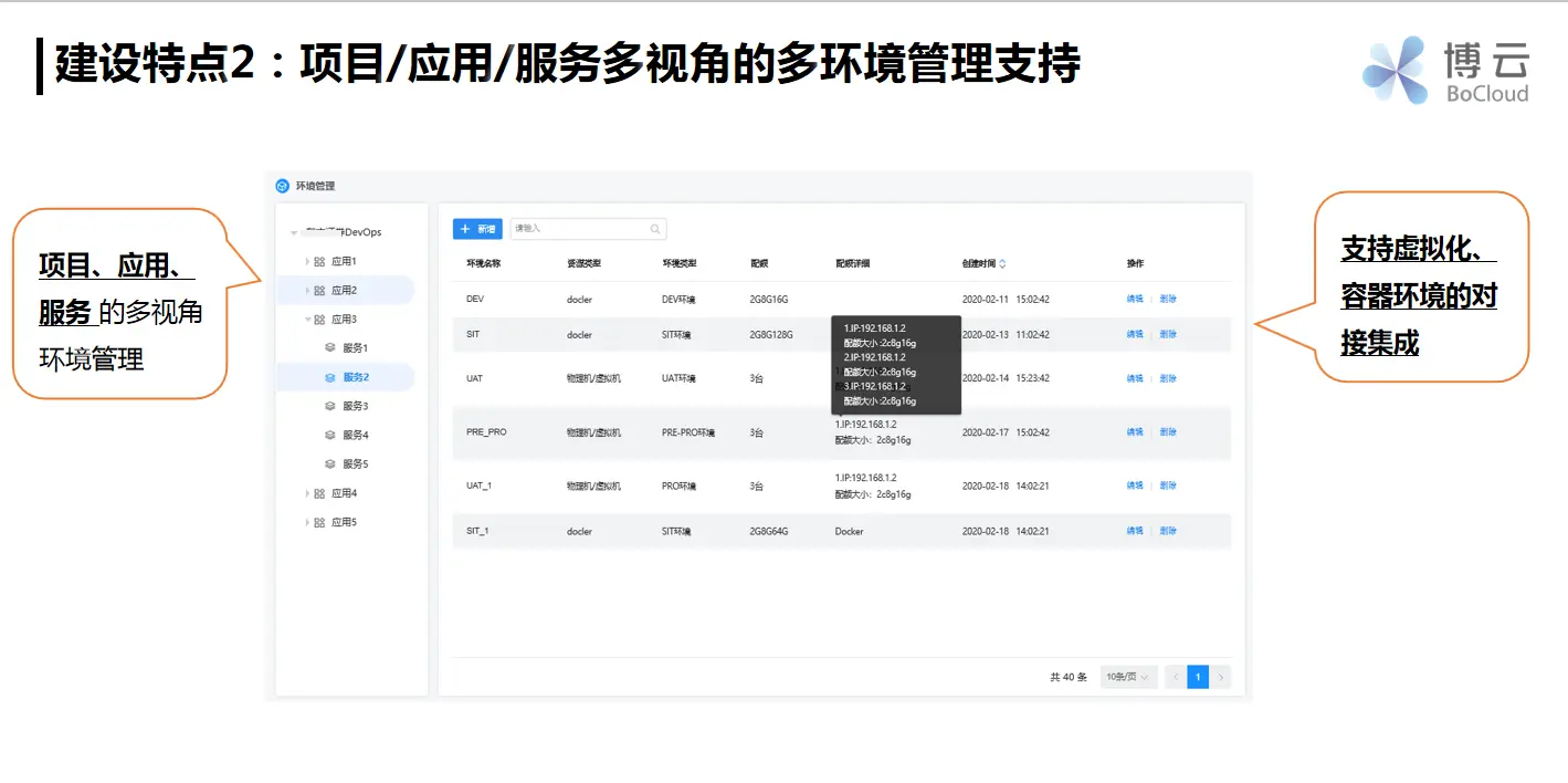 环境管理既重要又很困难。首先底层环境有很多种,可能需要与虚机环境,跟云平台、云管平台对接,还有容器化环境等不同的环境。其次,环境管理有时候是有项目视角的,有时候为这个项目分配了多少环境,同时项目里还有应用、服务、系统等概念,项目中可能有三套系统,并给这三套系统分配了不同的环境。还有一种是按最小粒度去分配,例如有5个服务,每个服务有不同的环境。这几个情况都有可能会出现。从环境角度来看,应用服务是个核心视角,也有项目视角,所以我们为客户设计了树状结构的多视角环境管理支持。这个树状结构有项目—应用—服务三级视角。