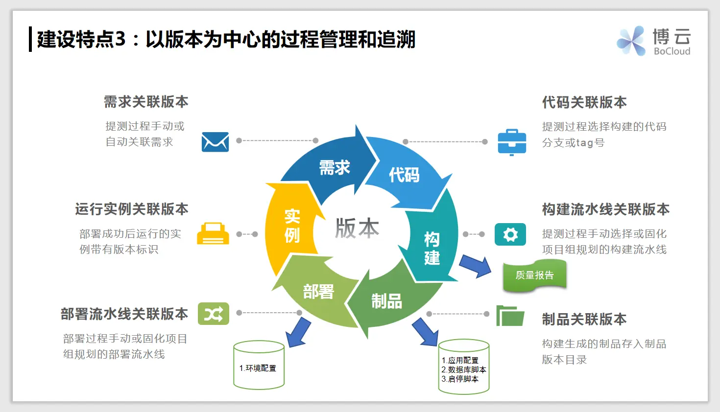 另外一个就是以版本为桥梁打通开发测试和生产环境。在开发测试和生产的过渡过程中,版本包含提测单、需求,也包含制品、配置、脚本这些所有的信息,这样从开发测试转化生产时,不仅是把制品转过去,也包含了整个配置和脚本信息,这样不仅能实现制品包移植,它的配置信息、脚本信息与开发测试环境也是一致的。