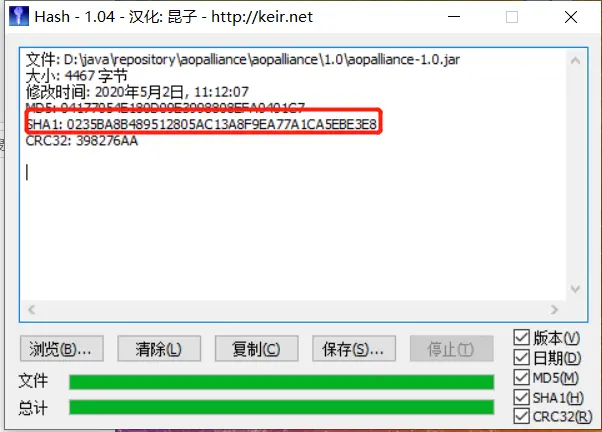 然后打开.sha1结尾的文件,例如:aopalliance-1.0.jar.sha1,然后比较两个SHA1码是否相等即可