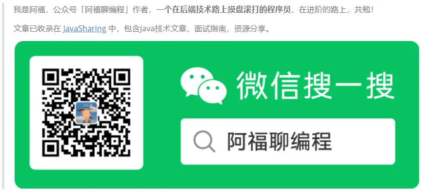 我是阿福,公众号「阿福聊编程」作者,一个在后端技术路上摸盘滚打的程序员,在进阶的路上,共勉!